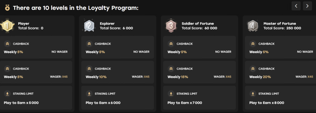 As players spend more time at the casino and actively participate in various games, they reach the intermediate levels (such as “Master” or “Expert”). At these stages, significant advantages become available, such as enhanced cashback offers and regular free spins. These levels are designed for regular players, offering new possibilities and further motivating them to participate in the casino’s various promotions and tournaments.